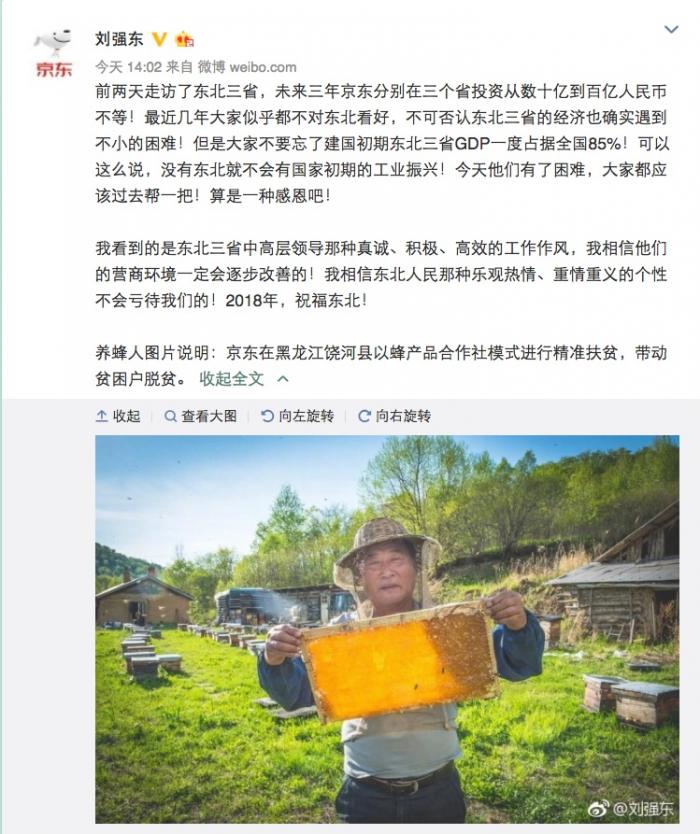 1月17日下午,京东集团董事局主席兼首席执行官刘强东在微博发文,就京东投资东北一事表达了自己的看法。