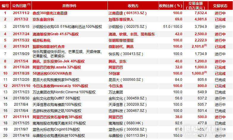 相比2016年,今年TMT行业发生的10亿美元以上并购交易从26起显著减少为10起。在2017年TMT行业前20大并购交易中,互联网巨头参与的交易近半数,包括360借壳、京东金融分拆、畅游私有化、猫眼和微影时代合并、今日头条收购musical.ly,以及腾讯、阿里、京东、滴滴等进行的多起战略并购。