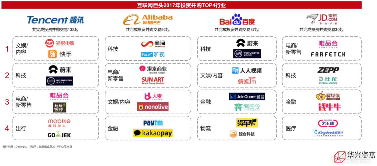2017年,BATJ等互联网巨头在保持对热点领域持续跟进的基础上,围绕自身的业务优势进行生态布局,电商/新零售、文娱/内容、出行、科技等板块是互联网企业关注的焦点。