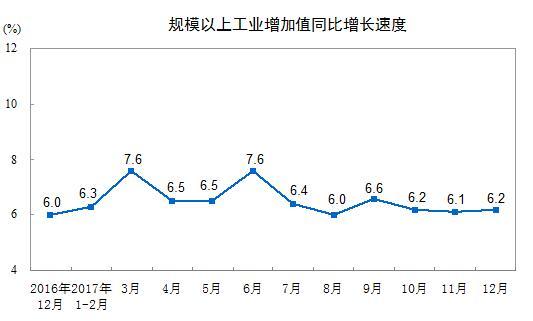 2017年12月份,规模以上工业增加值同比实际增长6.2%(以下增加值增速均为扣除价格因素的实际增长率),比11月份加快0.1个百分点。从环比看,12月份,规模以上工业增加值比上月增长0.52%。2017年全年,规模以上工业增加值比上年增长6.6%。