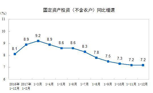 2017年,全国固定资产投资(不含农户)631684亿元,比上年增长7.2%,增速与1-11月份持平。从环比速度看,12月份比11月份增长0.53%。