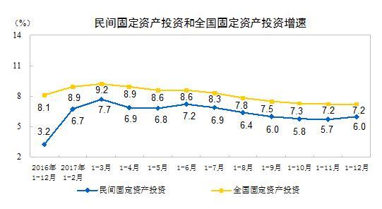 2017年,民间固定资产投资381510亿元,比上年名义增长6.0%,增速比1-11月份提高0.3个百分点。民间固定资产投资占全国固定资产投资(不含农户)的比重为60.4%,比1-11月份回落0.1个百分点。