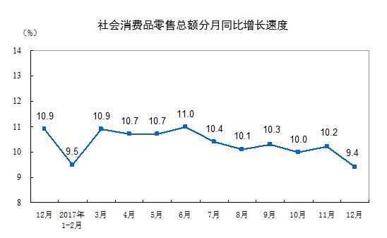 2017年12月份,社会消费品零售总额34734亿元,同比名义增长9.4%(扣除价格因素实际增长7.8%,以下除特殊说明外均为名义增长)。其中,限额以上单位消费品零售额17409亿元,增长6.7%。