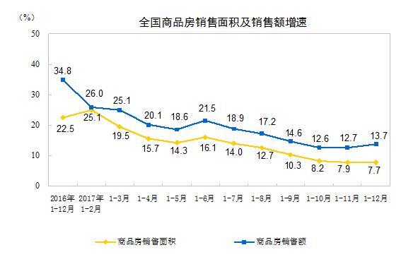 2017年,商品房销售面积169408万平方米,比上年增长7.7%,增速比1-11月份回落0.2个百分点。其中,住宅销售面积增长5.3%,办公楼销售面积增长24.3%,商业营业用房销售面积增长18.7%。商品房销售额133701亿元,增长13.7%,增速提高1个百分点。其中,住宅销售额增长11.3%,办公楼销售额增长17.5%,商业营业用房销售额增长25.3%。