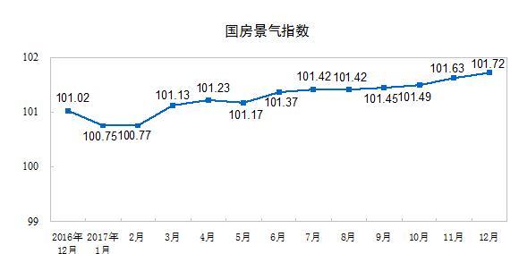 12月份,房地产开发景气指数(简称“国房景气指数”)为101.72,比11月份提高0.09点。