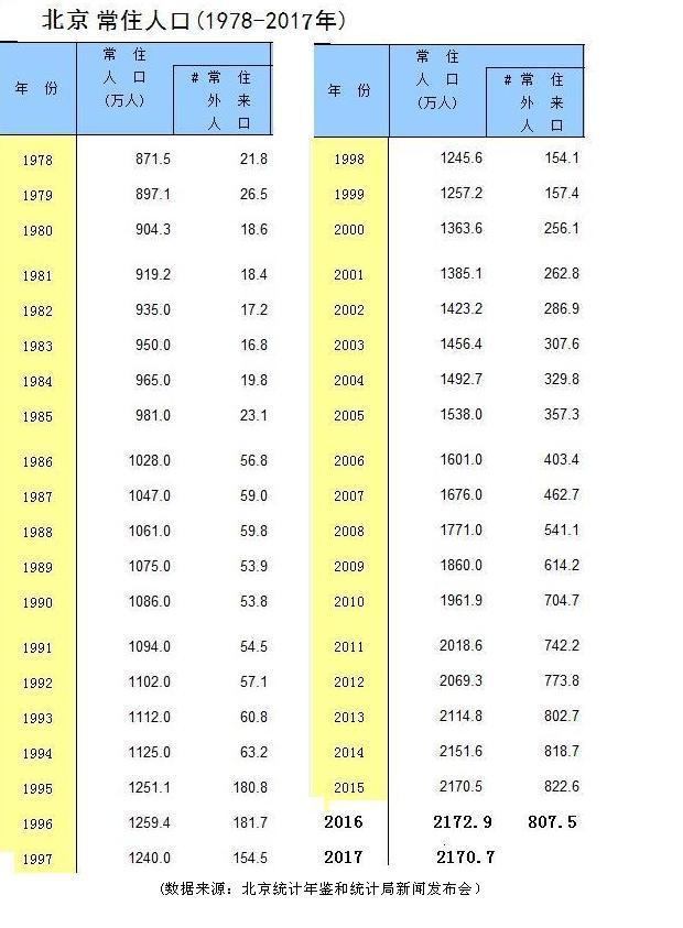 此前,从1978年到2016年,北京常住人口数量只是在1997年出现过一回下降,其余年份都为正增长。有时1年增长几十万,有时增加百万,比如2000年就增加了100多万常住人口,基本上是外来人口(增加了100多万)。目前北京外来人口占总量的3成左右。