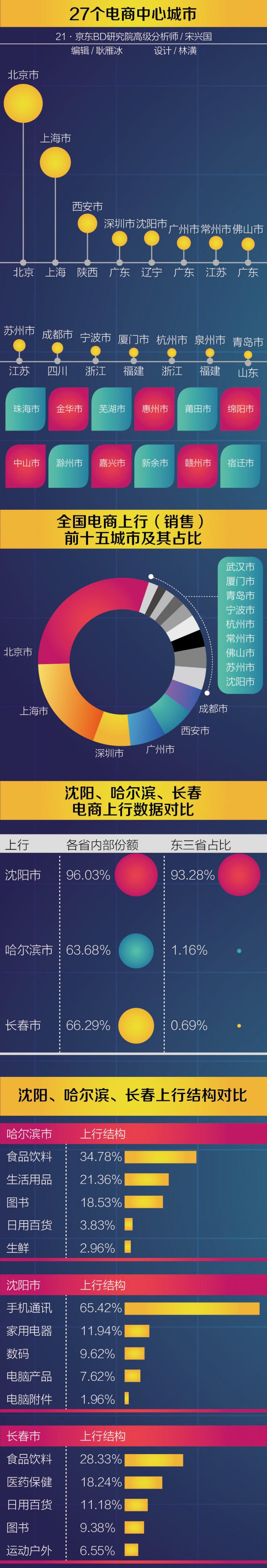 具体来看,沈阳是东北地区主要的电商区域中心城市,上行首位度超过90%,但分析数据可以发现,哈尔滨、长春在食品饮料、医药保健类产品上行存在优势,随着电商的普及和发展,这些产品走出区域走向全国甚至全球的渠道成本将大大降低。