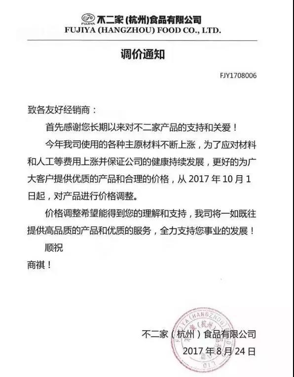 对于中国食品行业来说,涨价成为了2017年至今的“主旋律”。除康师傅、华润雪花与青岛啤酒,之前网上热传的多家食品企业告知经销商的提价函,涉及达利好吃点、沃隆每日坚果等知名品牌。实际上,自2017年2月起,涪陵榨菜、不二家等食品企业就已释放出调价信号。