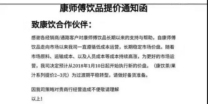 近日,快消龙头企业康师傅控股(00322.HK)发布的一份提价函,在市场惹起涟漪。据媒体报道,该提价函显示,康师傅控股预计从2018年1月10日开始执行新的价盘,康饮茶/果汁系列提价2-3元。