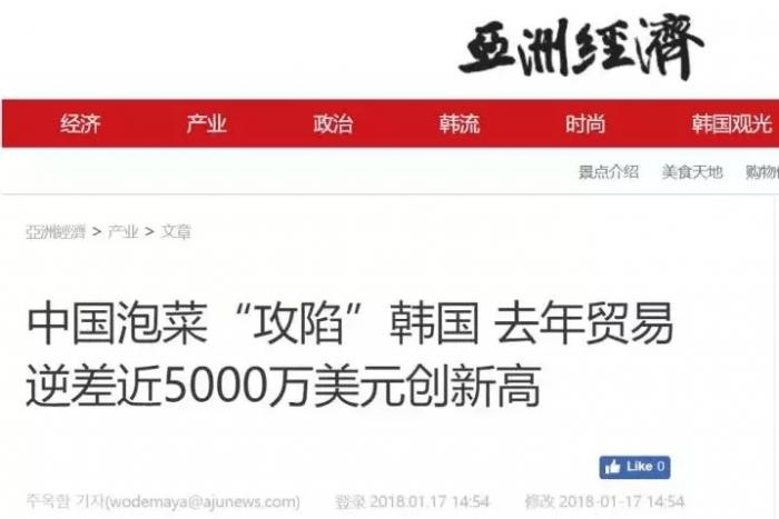 据韩国农水产食品流通公社的数据显示,2017年有27万吨中国泡菜输入韩国,占韩国泡菜进口的99%以上,出口却只有2.43万吨,不到进口数量的十分之一。价廉物美的中国泡菜,已经完全占据了韩国人的餐桌。