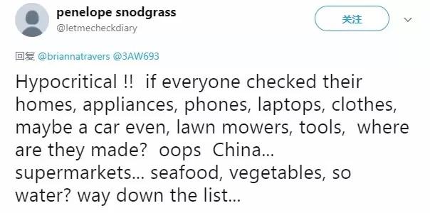 △“你们这样太虚伪了吧!你在家里看一圈,家用电器、手机、笔记本、衣服……再看看自己的车、割草机……这些东西都来自哪里?都是中国制造!再去超市看看,海鲜、蔬菜……还要说瓶装水吗?”