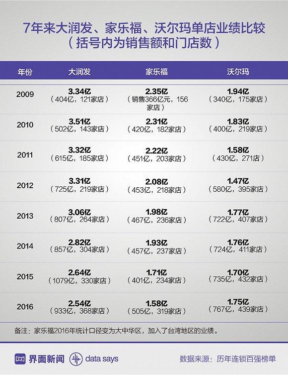 2012年后,家乐福中国业绩和利润,开始进入到双下滑的阶段。 到了2016年,家乐福的单店业绩从2009年的2.35亿元滑落至2016年的1.58亿元。而大润发和沃尔玛的单店业绩分别为2.54亿元和1.75亿元。