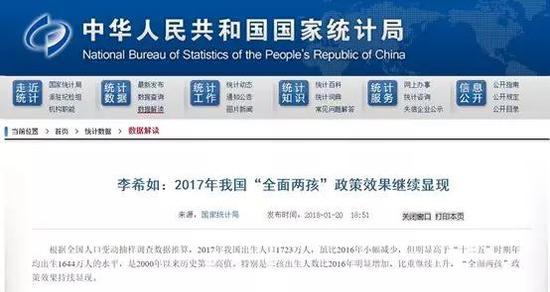 而国家统计局相关人员则表示,2016年和2017年,我国出生人口分别为1786万人和1723万人,比“全面二孩”政策实施前的“十二五”时期年均出生人数分别多出142万人和79万人。出生率分别为12.95‰和12.43‰,与“十二五”时期相比,分别提高了0.84和0.32个千分点。