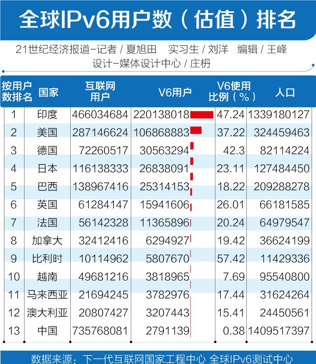 作为头号互联网用户大国,中国的IPv6用户普及率仅有0.38%,排名第67位。