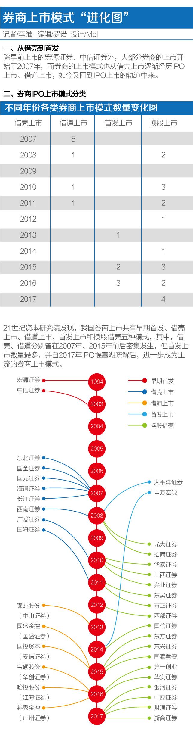 在市场的常规理解中,IPO才是企业上市的最主流方式。但我国证券公司的上市坎坷历程却呈现了另一种光景。在早年的行业整顿时期,券商无法通过IPO上市。在后来IPO窗口叫停时,券商也面临着堰塞湖的压力。因此借壳上市借道上市也成为不少券商所做的努力。如今证券公司通过IPO上市正在逐渐地步入正轨,伴随着发审效率的提高,相信会有越来越多的证券公司选择这一方式登陆资本市场。(罗诺)