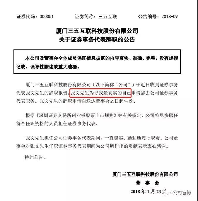 三五互联前证券事务代表张文一纸“寻找最真实自己”的离职公告,在资本市场引起了掀然大波。寻找最真实的自己,在A股市场上,这样的离职公告已经不是第一例。