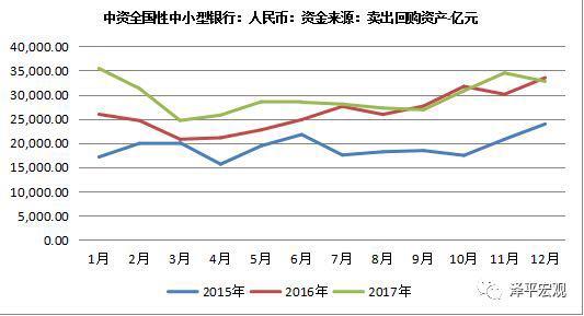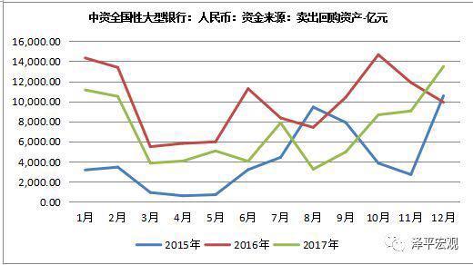中小型银行的卖出回购数据呈现出明显的上升趋势,2017年高于2016年,2016年高于2015年。而大型银行的卖出回购数据,除2016年略高外,2017年甚至出现回落。