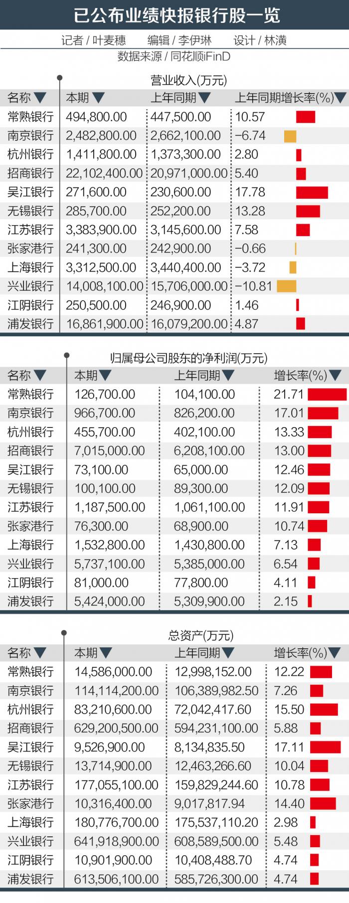 此外,南京银行、杭州银行、吴江银行、无锡银行、江苏银行和张家港行也成功实现净利润增速两位数增长。