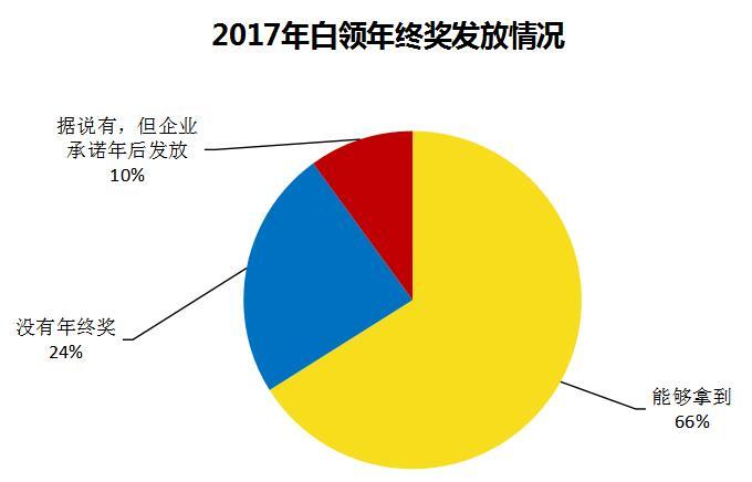 参与调查的白领中,66%的白领表示能拿到年终奖,高于2016年的39.5%;10%的白领表示可能拿到年终奖;没有年终奖的只有24%,相比2016年的50.9%均有较大改善。