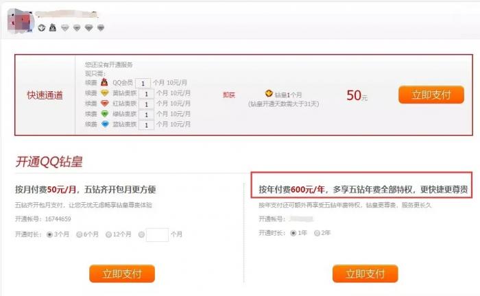 资料显示,QQ钻皇业务于2012年5月份上线(注:当时微信才1岁),用户需同时开通QQ会员、黄钻、红钻、绿钻以及蓝钻才能成为QQ钻皇,且仅限Q币Q点、网银/财付通开通。费用方面,按月付费50元/月,按年付费600元/年!