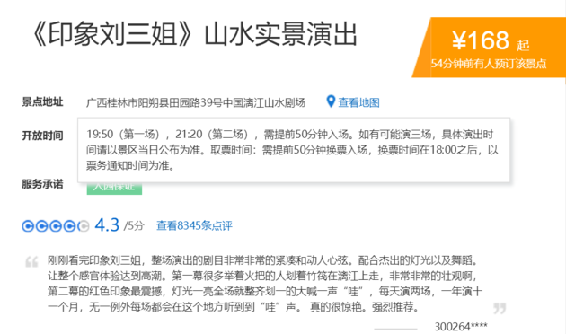 ▲携程网上印象刘三姐山水实景演出的门票为168元起(图/携程网截图)