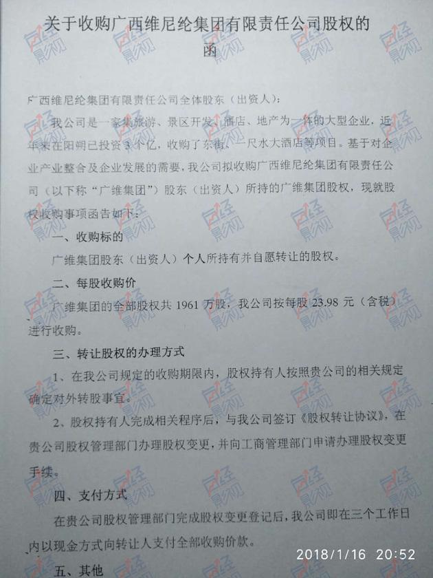 ▲广维集团职工向每经影视记者出示的当时的股权收购实施方案(图/每经影视记者摄)