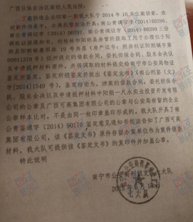 “而一尺水酒店和可高集团公章已被丁磊伪造公章后,用于抵押借贷,将借贷来的钱收购广维集团,酒店落入旁人手里”。梁沛农发给每经影视记者一份由南宁市公安局刑侦支队2015年出具的证明,该证明显示,经比对,涉案的借款合同公章、一尺水公司公章、可高集团公章与公安局存留的企业公章不是同一枚。