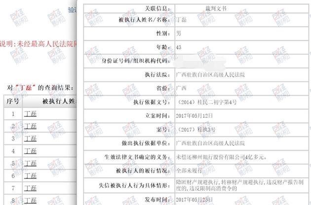 借款、抵押的泡沫破裂,2015年~2017年间丁磊被31次列入最高院的失信被执行人名单,也就是俗称的“老赖”黑名单,其中多是因欠债被法院要求偿还却拒不履行。案号为“(2017)桂执3号”的法院文书显示,最近一次是2017年5月,未偿还柳州银行4亿多元,具体情形是隐匿财产规避执行、转移财产规避执行等。
