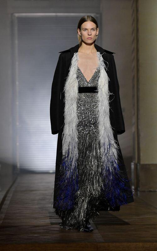 新任创意总监Clare Waight Keller在纪梵希(Givenchy)带来的首个高定系列则呈现了女性略有刚强气概的一面。她在女装中融入男装锋利挺括的剪裁,再用流苏装饰加以柔和;或是在银色羽毛长袍外罩上军装外套。“我想用一种女性化的方式呈现剪裁的力量。高定带给我发挥想象力的全部自由,整个系列有三分之一都是黑色。”Clare Waight Keller在接受Vogue采访时表示。