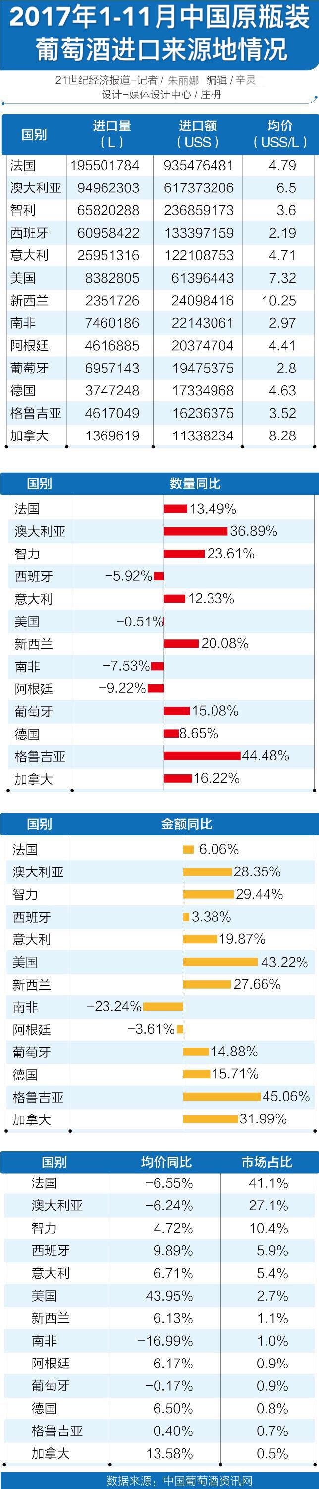 中国与澳大利亚于2015年12月签署自由贸易协定,自生效后葡萄酒进口关税将每年降低2.8%,并在4年内逐渐变为零关税。目前,中国已经成为澳大利亚葡萄酒的第一大出口国。据澳大利亚葡萄酒管理局(Wine Australia)统计,2017年澳大利亚出口中国的葡萄酒总值上涨了63%,达到8.48亿澳元,出口量同比激增53%达到1.53亿升,平均价格上涨6%至5.55澳元/升。