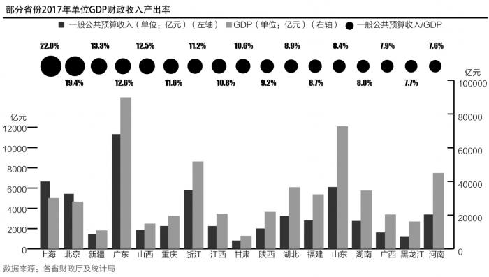 数据分析发现,上海、北京、广东、浙江这些东部发达省市单位GDP的财政产出率比较高,新疆、山西、重庆等部分中西部省份相对靠前。