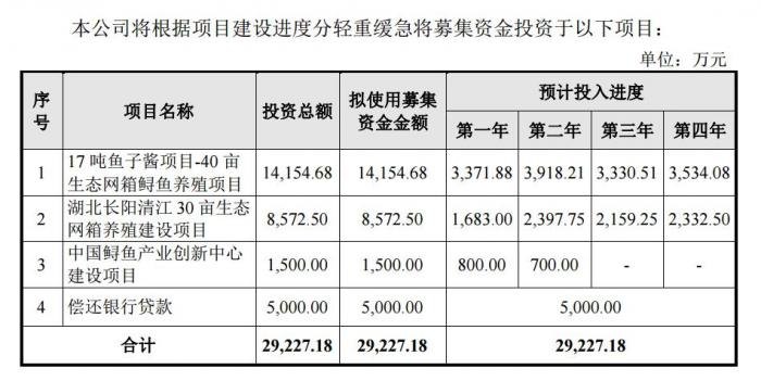 此次发行,鲟龙科技拟募资2.92亿元,用于四个项目,除了5000万元用于偿还银行贷款外,其他资金均用于公司主营业务相关,如养殖项目和逊于产业创新中心建设等。