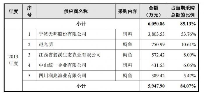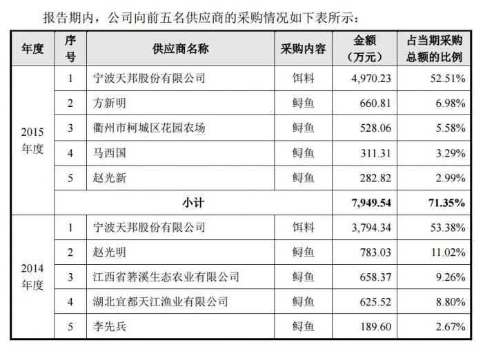 2013-2015年,鲟龙科技主要饵料供应商为宁波天邦股份,对其采购占比较高,超过当期采购总额的50%。其他的供应商中,2013年和2014年主要供应商之一赵光明为鲟龙科技子公司湖北鲟龙的总经理;2015年年底,公司收购了2013年和2014年主要供应商之一江西省箬溪生态农业70%的股权。