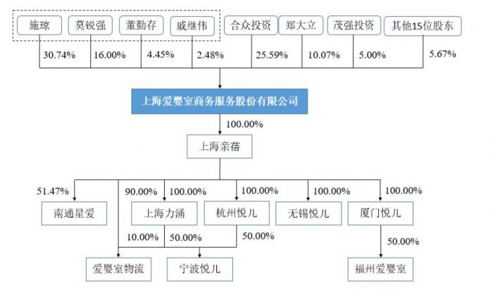 爱婴室的第一大股东为施琼,公司发起人共24名,包括施琼等22名自然人和新企投资、茂强投资。其中前四大股东施琼、莫锐强、戚继伟和董勤存签署了一致行动人协议,为公司共同实际控制人,分别持股2305.78万股、1200万股、755.26万股和333.45万股。
