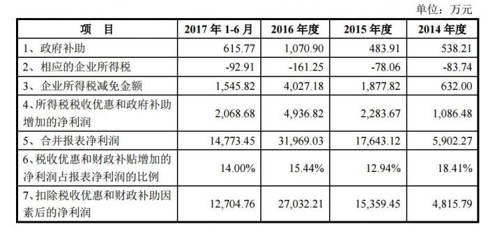 2014年-2017年上半年,伯特利分别收到了538.21万元、483.91万元、1070.90万元和615.77万元的政府补助,以及632.00万元、1877.82/4027.18万元和1545.82万元的所得税减免金额。税收优惠和财政补贴增加的利润占净利润比例分别为18.41%、12.94%、15.44%和14.00%。