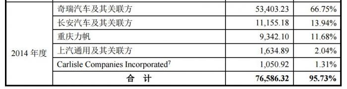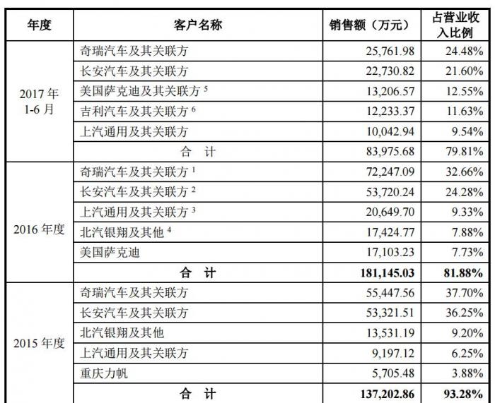 伯特利2014年至2017年上半年,前五名销售额合计分别为7.67亿元、13.72亿元、18.11亿元、8.40亿元,占公司当期营业收入的比例分别为95.73%、93.28%、81.88%、79.81%。尽管呈现下降趋势,但占比仍保持在80%左右。