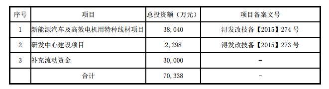 长城股份拟募资7.03亿元,用于三个项目,其中3.80亿元用于新能源汽车及高效电机用特种线材项目,3亿元用于补充流动资金。