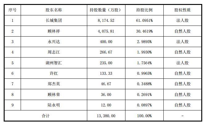 发行前,公司共有9位股东。其中控股股东顾林祥直接及间接持有公司股份比例合计为76.2832%,现担任公司董事长兼总经理。第一大法人股东长城集团的股东为顾林祥与沈宝珠夫妇,长城集团的股东沈宝珠与湖州智汇的股东沈宝荣为姐弟关系,湖州智汇为公司第五大股东,持股数量为235万股,占比为1.7564%。