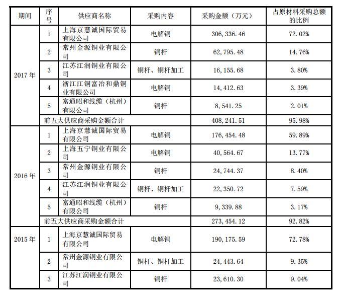 2015年-2017年,长城证券向前五大供应商采购原材料的金额分别为251574.14万元、273454.12万元、408241.51万元,占当期原材料采购总额的比例分别为96.28%、92.82%、95.98%。其中,2017年第一大供应商上海京慧诚国际贸易有限公司采购数占原材料采购总额比例达到72.02%。