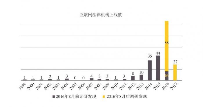 《报告》显示,自2014年开始,互联网法律机构上线进入上升阶段,至2016年达到高峰