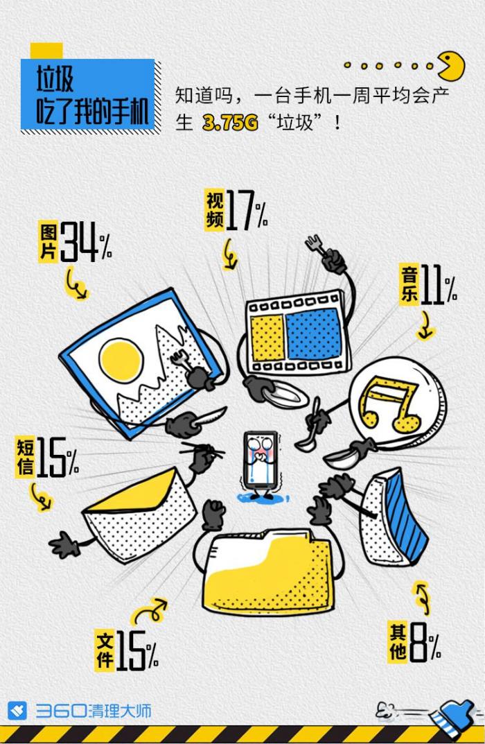 2017年,一台手机每周平均会产生3.75G的手机垃圾,其中图片占34%、视频占17%,二者合计占据了手机垃圾的“半壁江山”。令人意外的是,平时几乎不被人注意的短信,也占据了15%的垃圾空间。
