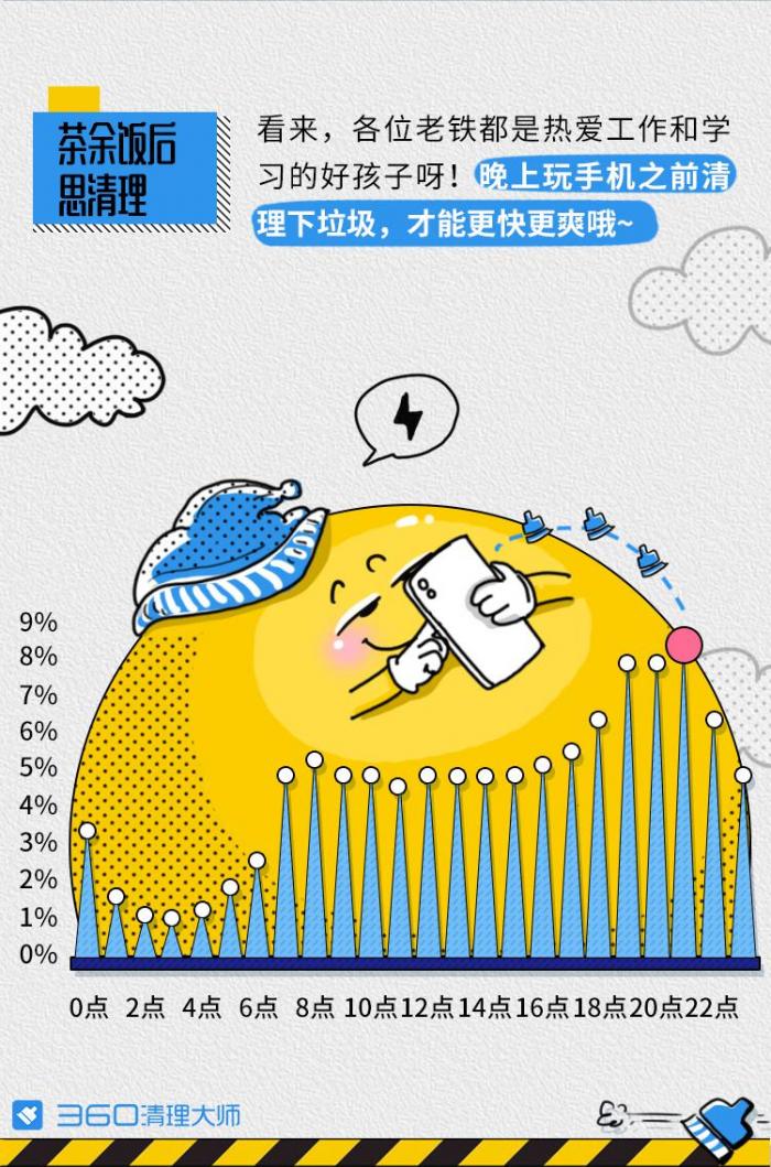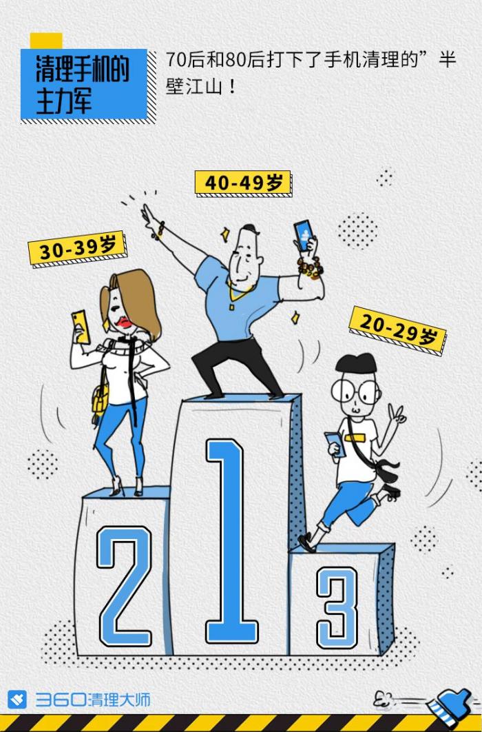 《报告》显示,一台手机每周平均会产生3.75G的手机垃圾,其中图片和视频垃圾占比过半。相比年轻的90后,70后和80后打下了手机清理的“半壁江山”,成为了清理手机的主力军。清理手机的高峰期是在每天晚上18点到21点之间,看来悠闲时间清理下玩手机才能更方便。微信、短信和自拍是“制造”手机垃圾的“三座大山”,而微信程序中聊天图片、聊天表情包和微信小视频又是需要清理的重点内容。