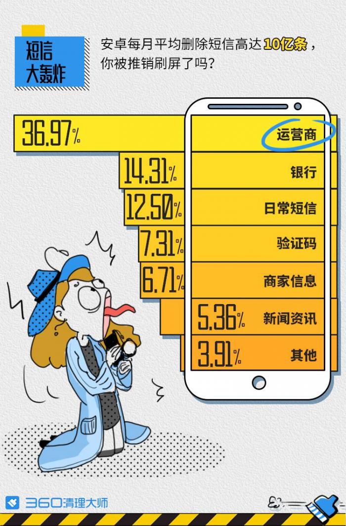 同时,短信也是垃圾内容的重灾区。报告显示,仅安卓客户端每月平均删除的短信就高达10亿条。在这10亿条短信中,占比最大的是运营商短信,达到了37%,其次是银行短信、日常短信和验证码,占比分别为14.31%、12.5%和7.31%。单条短信虽然很不起眼,但几千条短信汇聚在一起体量也是非常庞大的,用户应当及时清理。