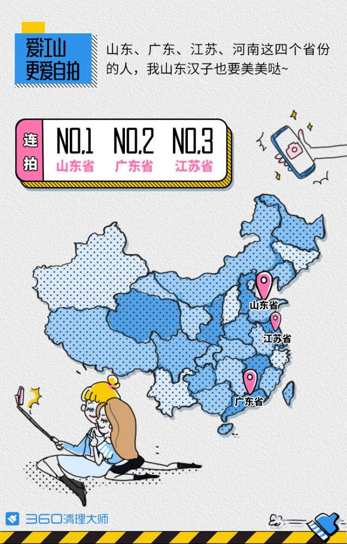 自拍以及其它照片也是最常见的手机垃圾内容来源之一。如今很多用户在进行拍照时会选择连拍,然后挑选合适的照片。360清理大师的报告显示,最爱连拍的是山东、广东、江苏的用户,同时在照片美化上他们也是位居前列。