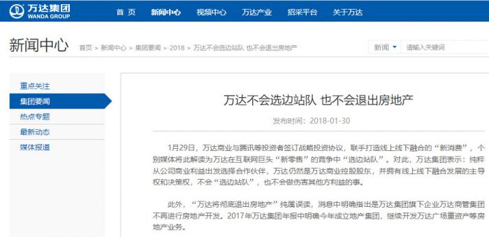 1月30日早间,万达集团在官网发布文章称,1月29日万达商业与腾讯等投资者签订战略投资协议,联手打造线上线下融合的“新消费”,个别媒体将此解读为万达在互联网巨头“新零售”的竞争中“选边站队”。
