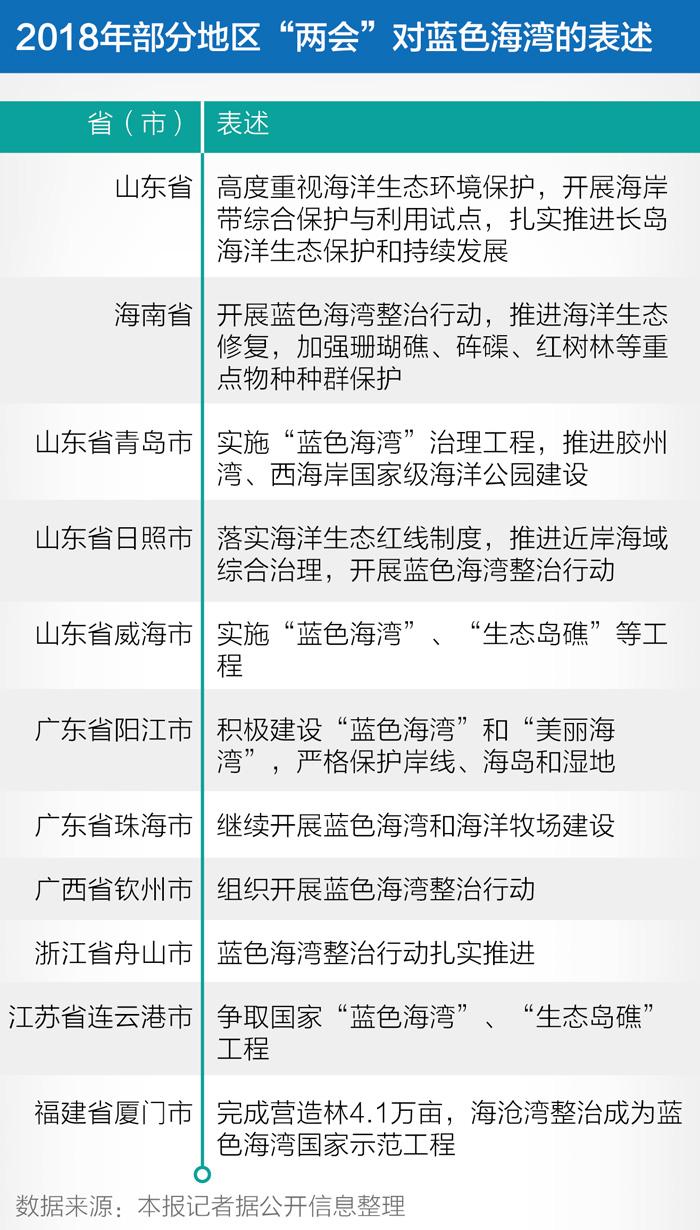 事实上,目前多个沿海地区也在当前经济效益和环境保护的选择题中,逐渐认识到后者的重要性。在今年陆续结束的地方“两会”中,21世纪经济报道记者注意到,已有超过10个沿海地区将“蓝色海湾”纳入到2018年的政府工作报告之中。
