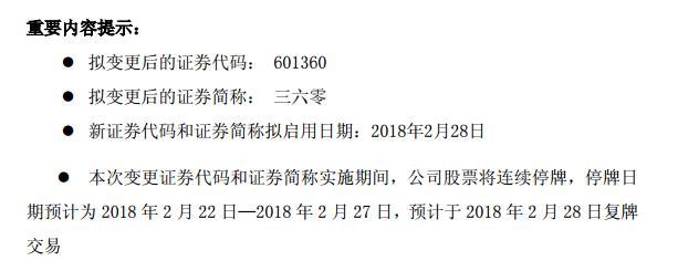 2月1日,江南嘉捷公告称,自2018年2月28日起,变更公司证券代码和证券简称,拟变更后的证券简称:三六零;拟变更后的证券代码:601360。此外,2017年年度股东大会将于2月22日13点30分召开。