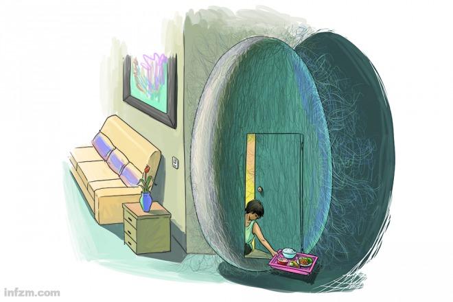 “就像一个把自己拼命裹在茧丝里的幼虫,失去了应有的生命力。”叶敏捷说,唯一与外界接触的时刻,是这些孩子出来拿父母放在门口的食物,拉开房门取托盘的一瞬。迫不得已时,也只通过手机信息或字条与家人交流。