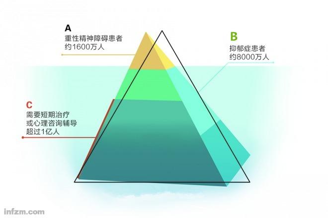 原广州脑科医院精神科医生、昭阳医生的创始人林昭宇把精神障碍人群用一个金字塔结构描述。塔尖是最严重的六种重性精神病患者,约1600万人,这是被看见且被社会重点关照的部分,但只占据全部人口的1%。余下的2.3亿人——如同水面之下的庞大冰山若隐若现。