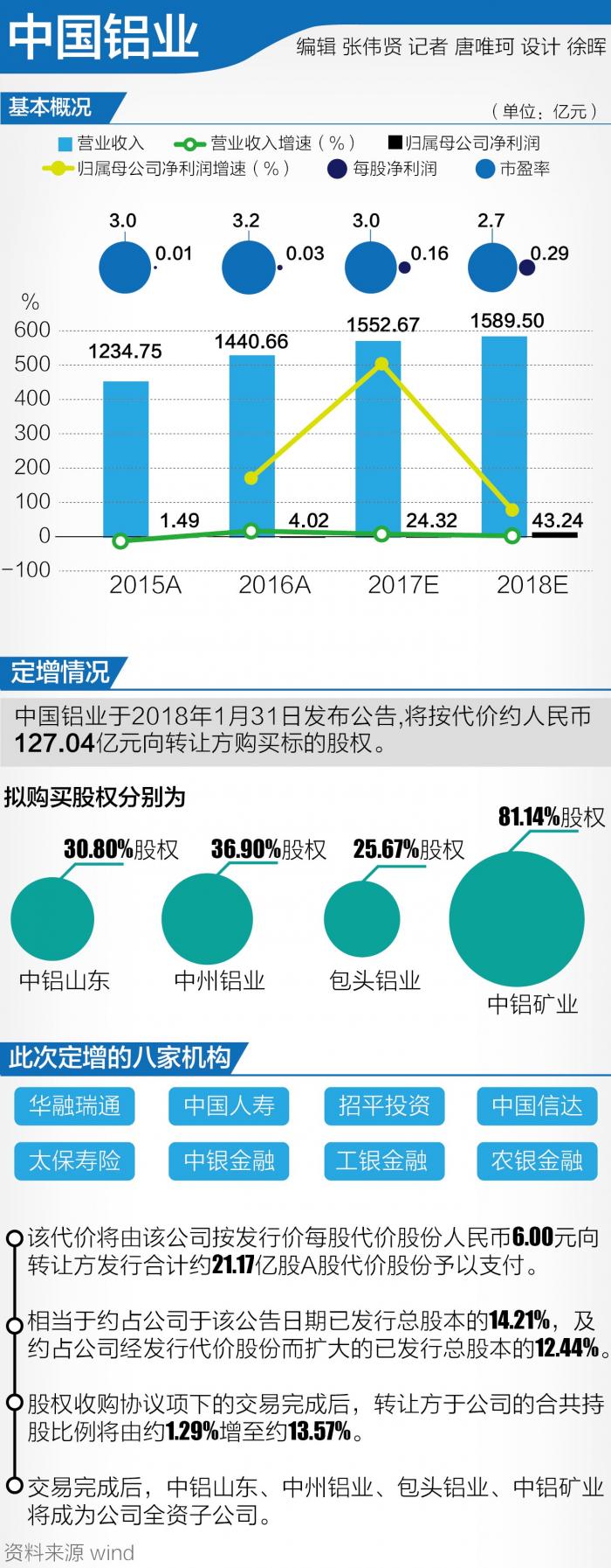 根据中国铝业1月31日晚间披露的《中国铝业股份有限公司发行股份购买资产暨关联交易预案》,中国铝业拟定向发行21.17亿股A股股份,向华融瑞通、中国人寿、招平投资、中国信达、太保寿险、中银金融、工银金融和农银金融等8名交易对方,收购其合计持有的包头铝业25.67%股权、中铝山东30.80%股权、中州铝业36.9%股权和中铝矿业81.14%股权。
